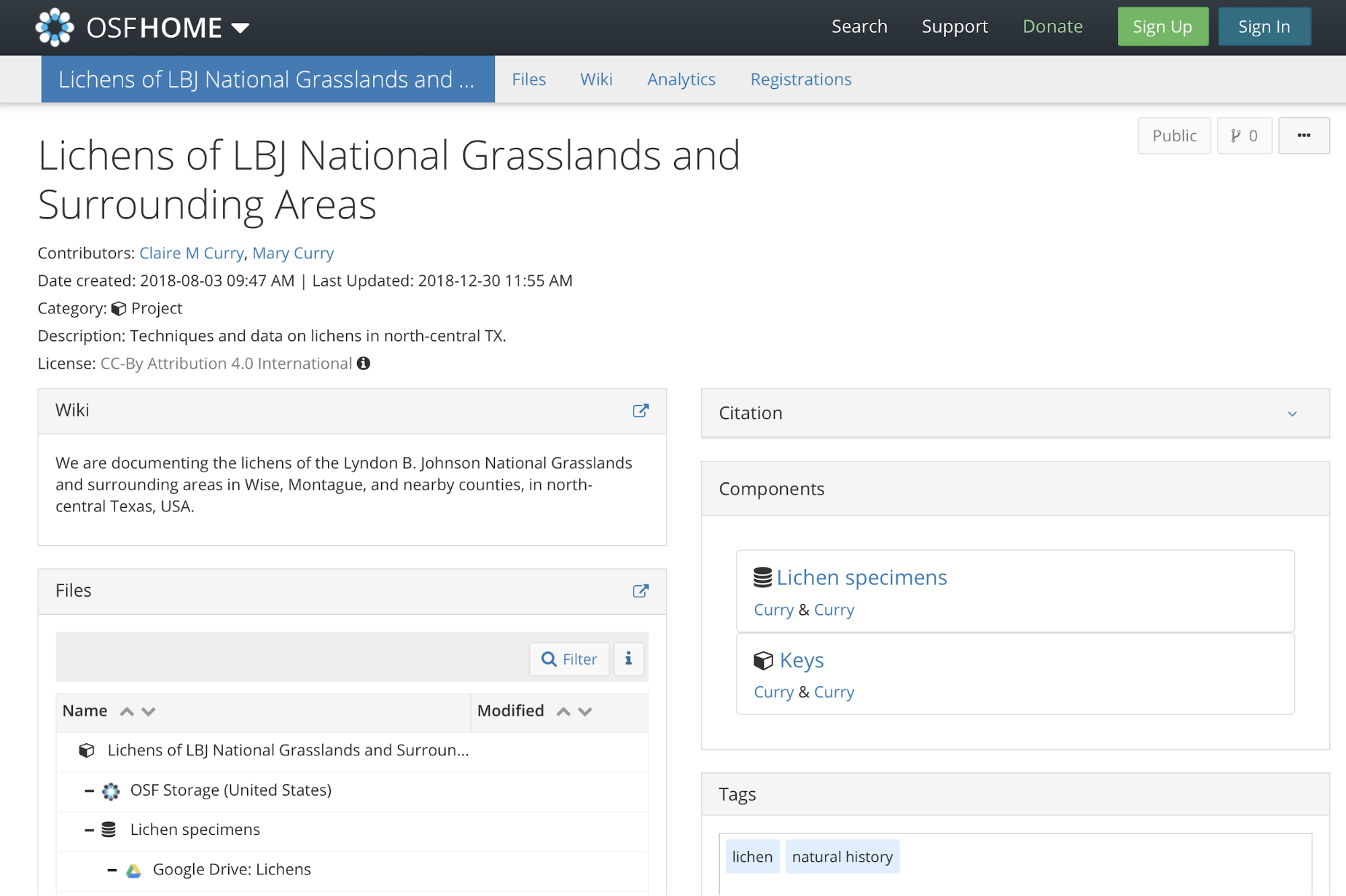 Once you create a project in OSF, the platform allows you to add files, write a wiki, assign collaborators/contributors, assign a license, and register a DOI. Projects can be public or private. But the structure you can add to a project is one thing that makes OSF such a powerful tool. You can have different components for a project (and components inside those components); e.g. methods, data, analysis. Each component can have different attributes too – wikis, privacy settings, collaborators/contributors, and file storage. There are two options for adding your data to an OSF project or component – internal OSF storage, or you can link a third party services like Google Drive, DropBox, and GitHub. If you link one of your cloud services to and OSF project and/or component, you can specify exactly which files or folders you want to give access to. All components (including OSF storage files) have unique, persistent URLs. Also, OSF allows you to track versions of your files and there are analytics tools that allow you to track how people are interacting with your data. For anyone who is concerned with dependability, OSF has a preservation fund that, at this time, will keep all hosted projects and data up for at least 50 years.