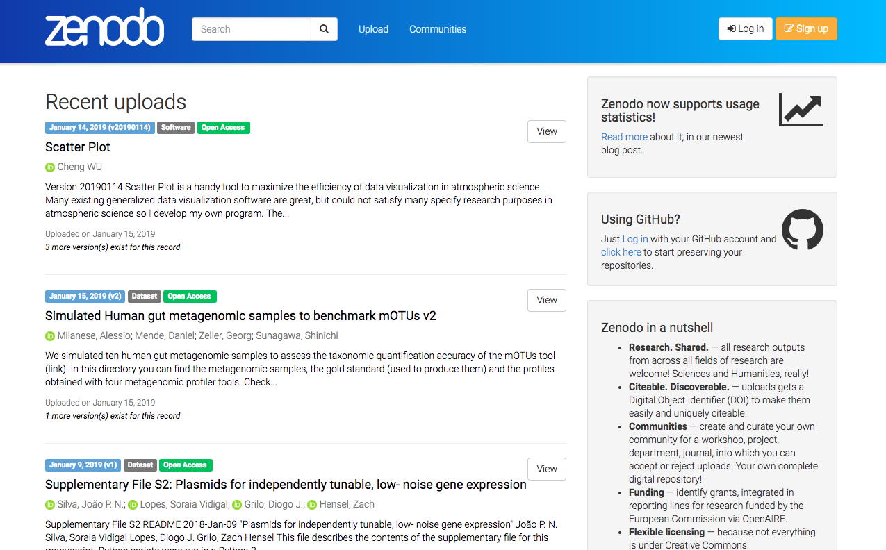 Zenodo’s preservation plan is less robust than Figshare’s, and currently Zenodo can only host files 5 GB or less in size. Zenodo also lacks public page view and download statistics, meaning that you can’t track the popularity or reuse of the data you submit to the archive.