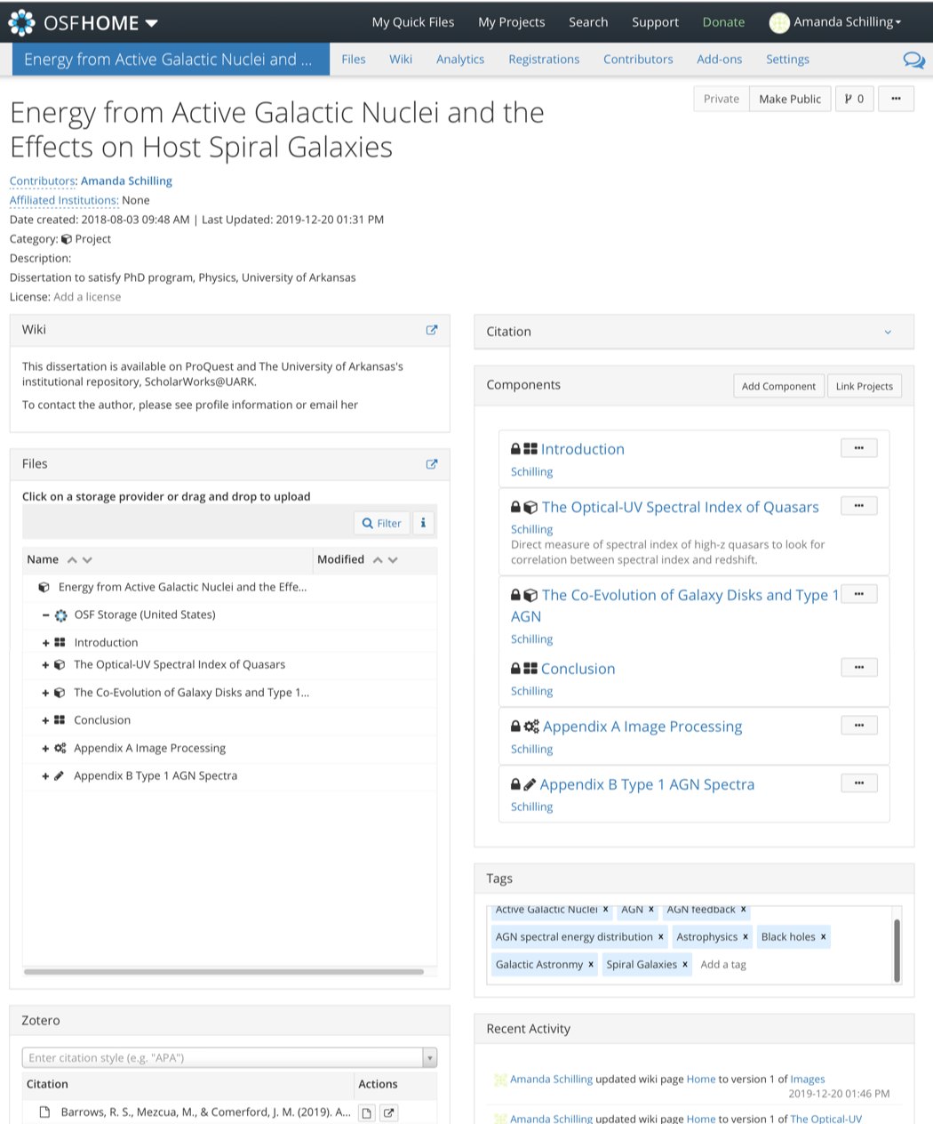 - To the right of the Zotero box you can see the tags Amanda added to her project, which will be useful if/when she decides to make this project public. People searching OSF for information and project about “spiral galaxies,” for example, will see Amanda’s project (assuming she has made it public) in their search results.