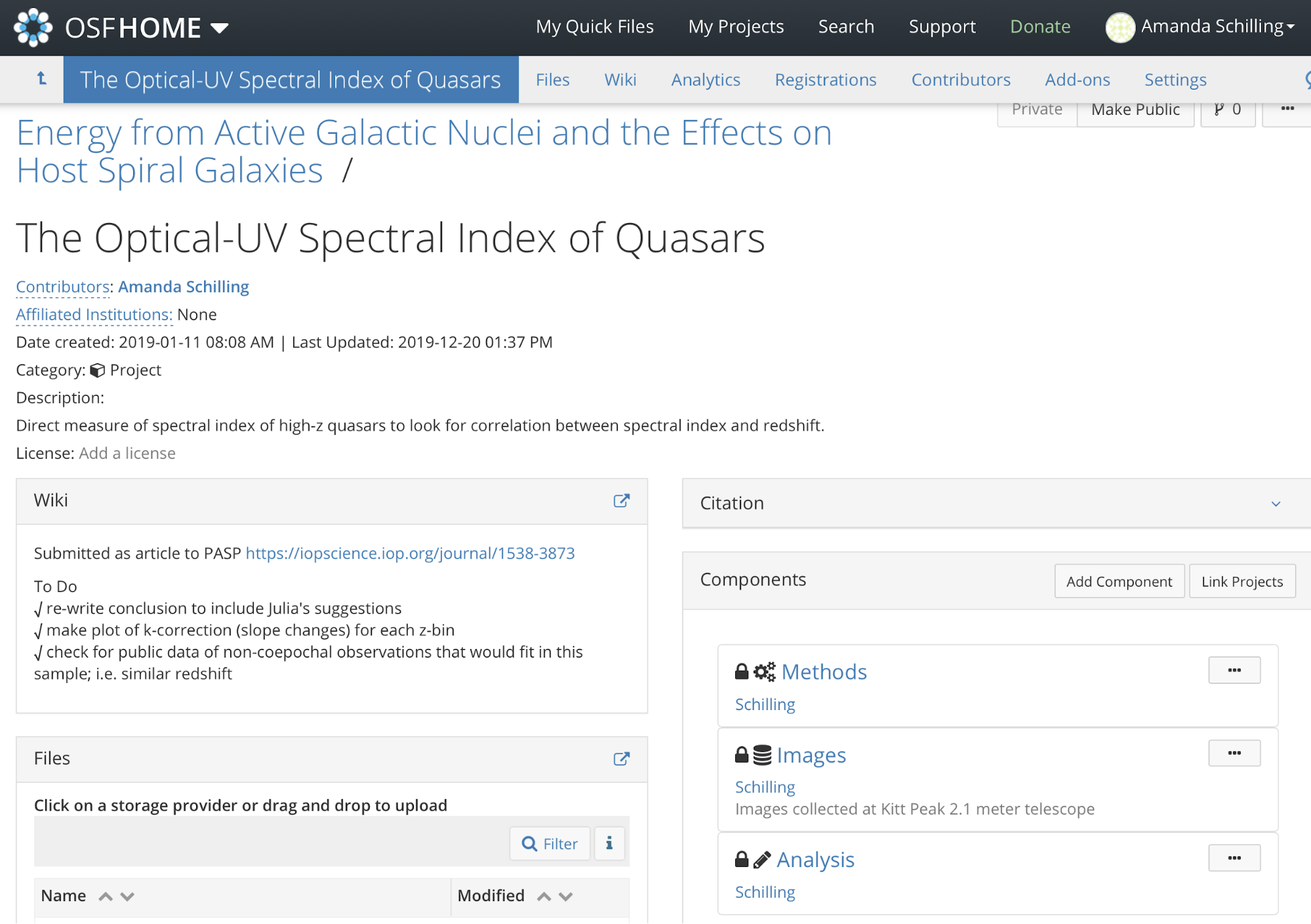 - Next up is the “Components” box on the right. Amanda has organized her project by creating a component for each chapter in her dissertation. Clicking on the component “The Optical-UV Spectral Index of Quasars” bring us to this page: