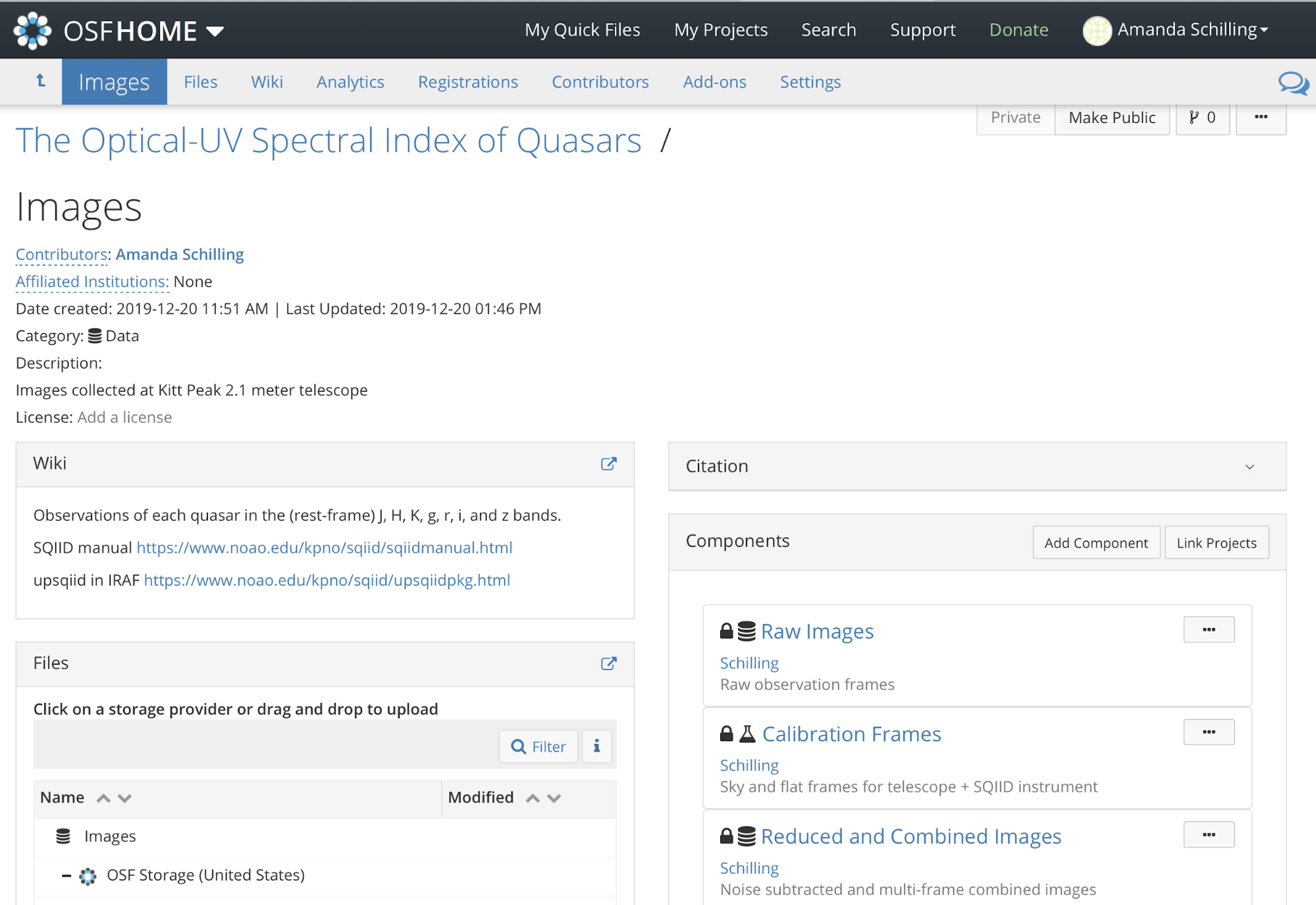Once again, Amanda has written a separate wiki that describes her data and also has several components in the “Images” component including Raw Images, Calibration Frames, and Reduced and Combined Images (processed data). You can imagine this will be useful when Amanda wants to share her processed data – all she has to do is make “Reduced and Combined Images” a public component instead of keeping it private. And she doesn’t have to make any other component public!