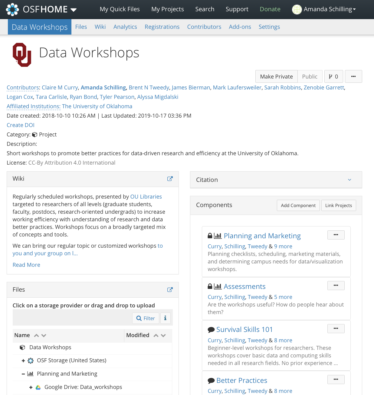 In our next example, you’ll be meeting a group of librarians who use OSF as a collaborative project manager and organize materials for the workshops they offer at OU. Take a look at their OSF project page: