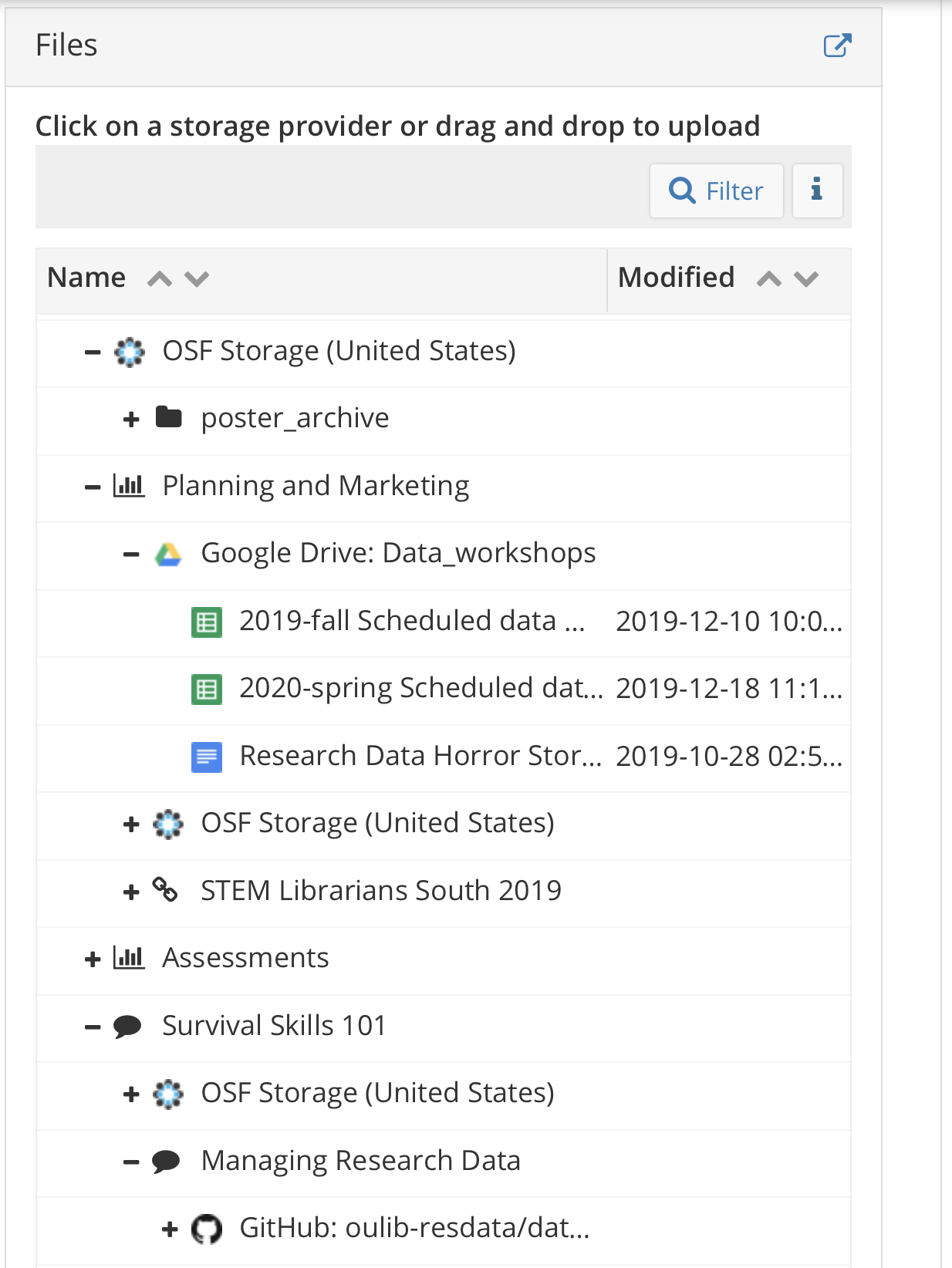 If we look more closely at the “Files” box, we see that this group is using OSF storage as well as Google Drive and even a GitHub repository. This is particularly helpful when working with a group of contributors who use different cloud services or platforms to save their work.
