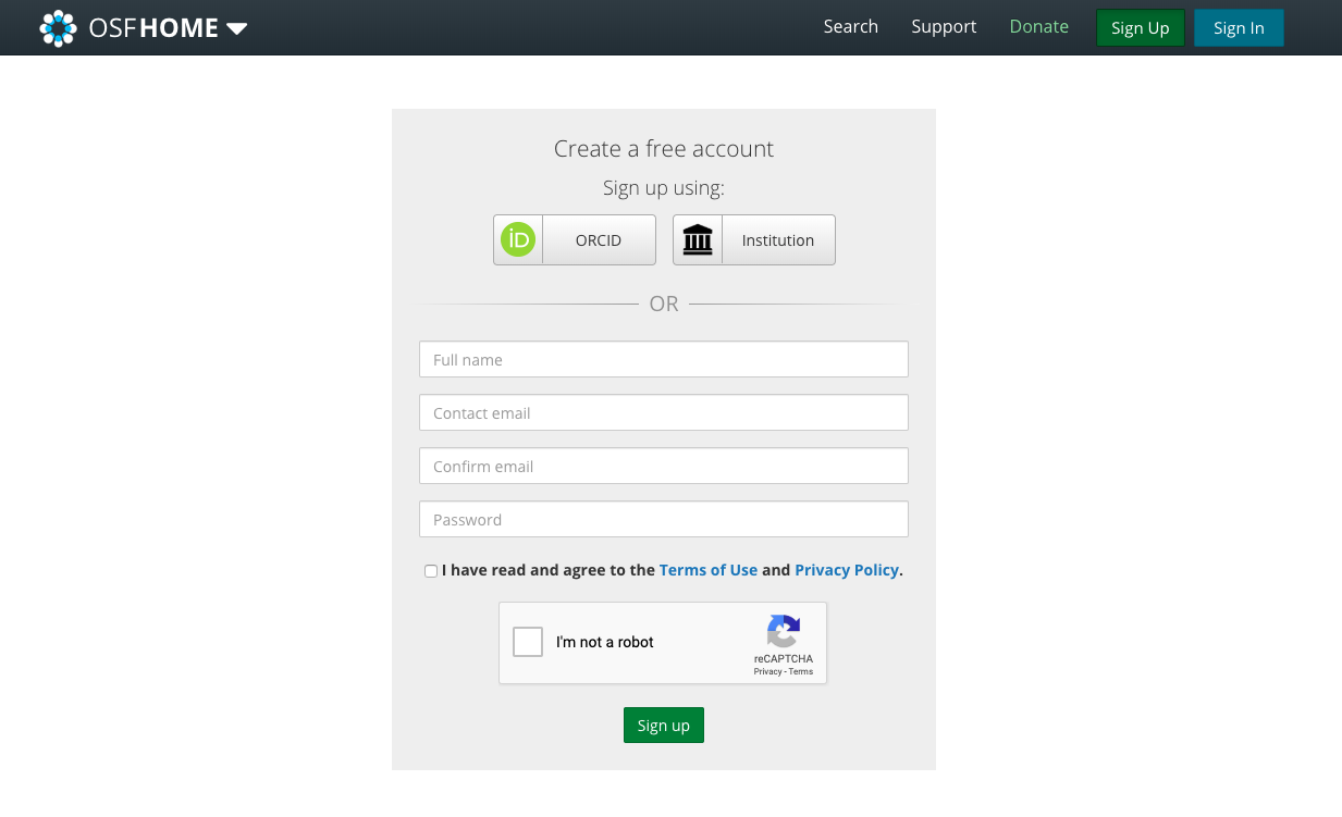 Now that you’ve seen the basics of OSF, you’re going to get started on a project of your own. We promise – getting started is easy! Navigate to the OSF home page, and click on the “Sign Up” link at the top right or the “Get Started” button right in front of you.
