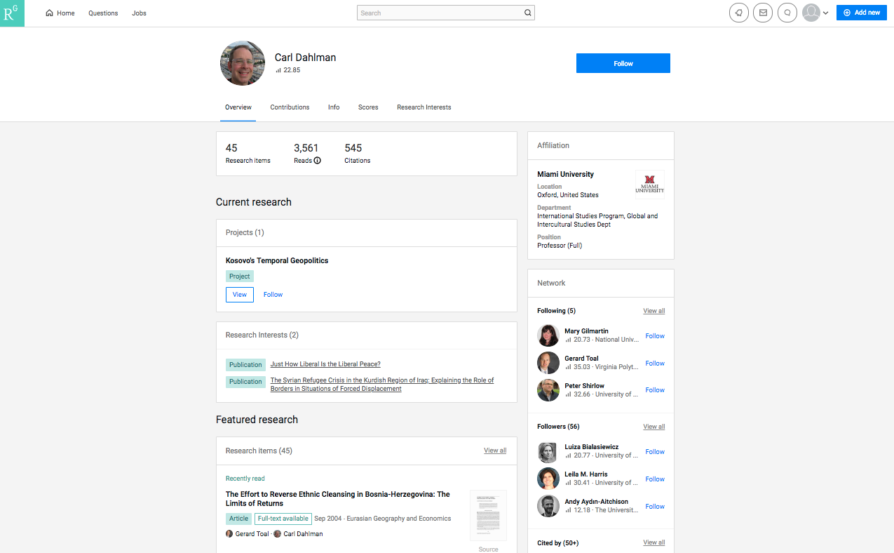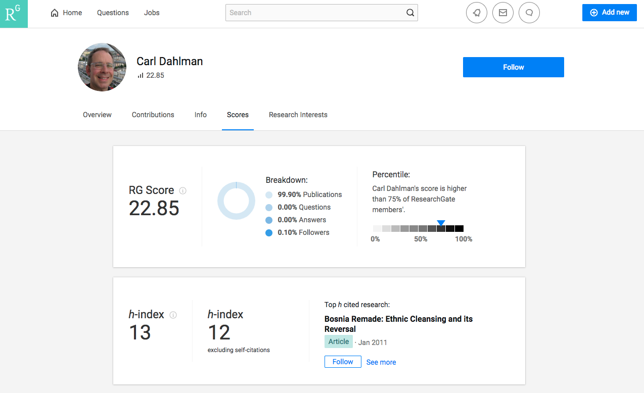 If you’re into metrics, the ResearchGate score and stats offer lots to explore. The ResearchGate score is an indicator of your engagement on the site: the more publications and followers you have, plus the more questions you ask and answer, all add up to your score. We’ll use Carl Dahlman’s profile as an example again: