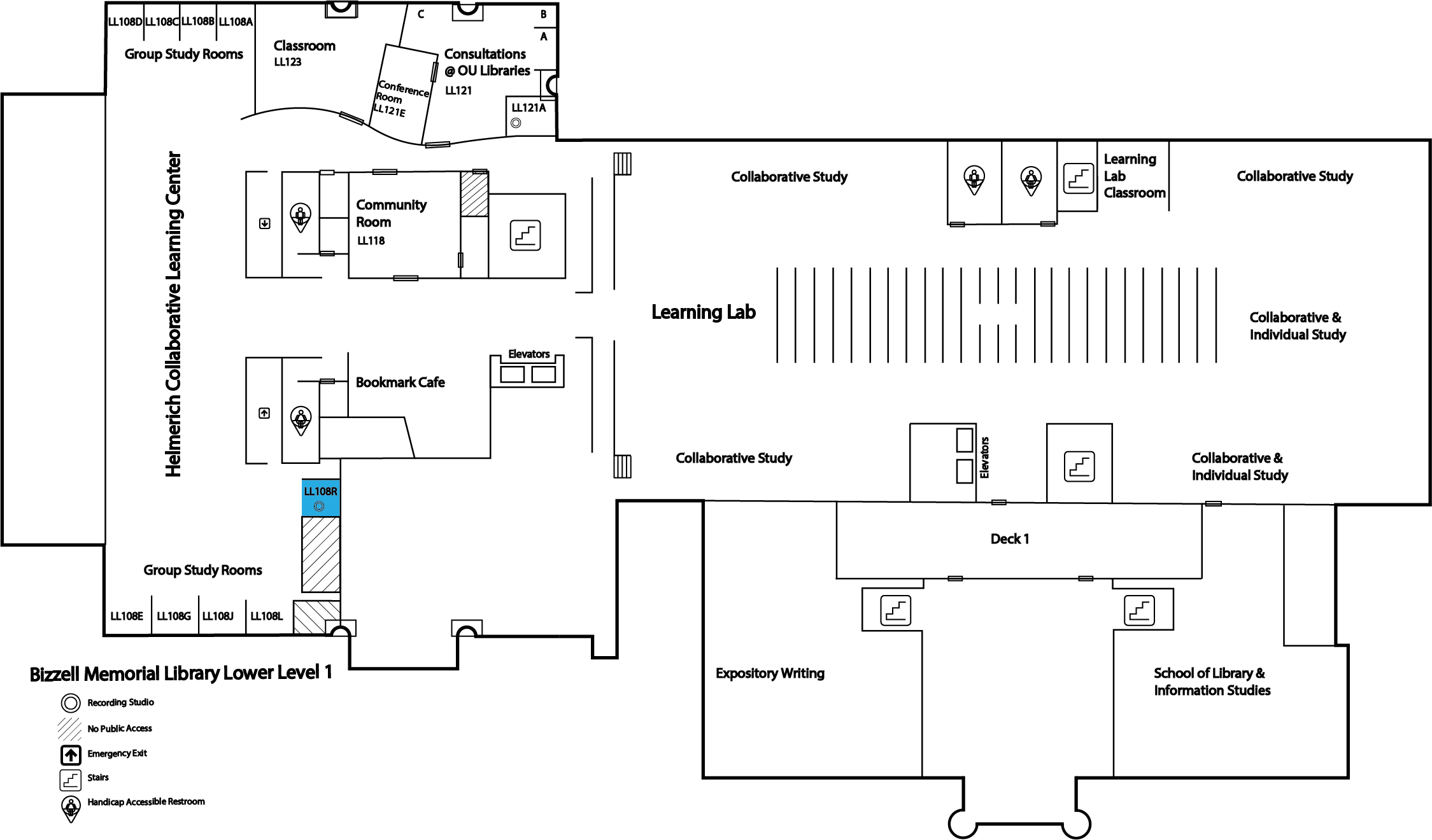 • A key must be checked out from the Computer Lab on the Main Floor of Bizzell Memorial Library to access the Podcast Studio.